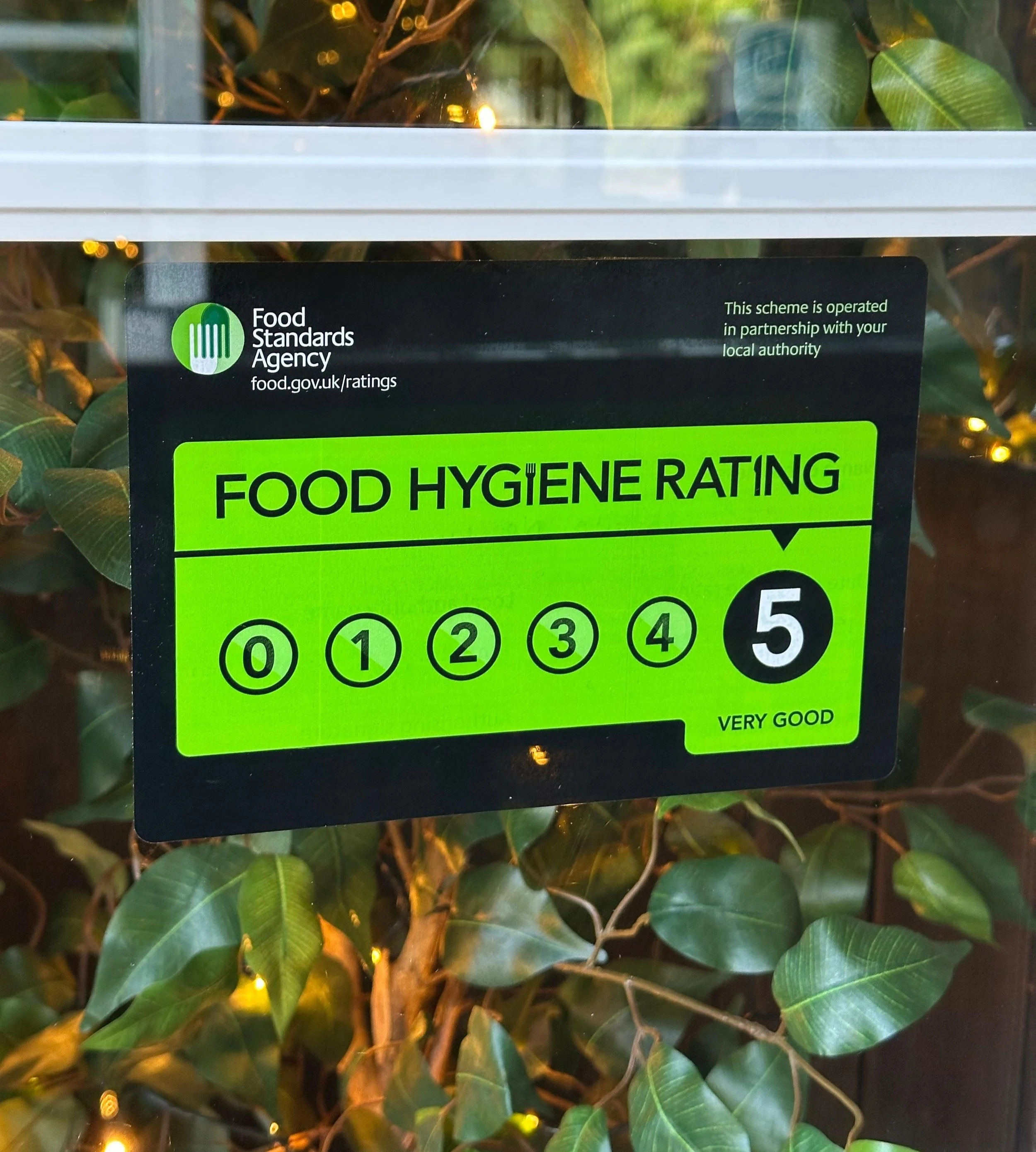 We’re rated 5 - Very Good by the Food Standards Agency for our food hygiene.